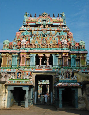 The spider worshipped the Lingam by spinning a web on top, to protect it from falling leaves. The elephants worship would destroy the spiders web, and the spiders web amounted to desecration in the eyes of the elephant leading to animosity between the two, of such proportion that a fight between them resulted in the death of both. The spider was born again in the royal Chola family (in Uraiyur - during the Sangam period). An interesting tale is associated with his birth. His parents Subhadeva and Kamalavati prayed to Nataraja of Chidambaram for a male successor.